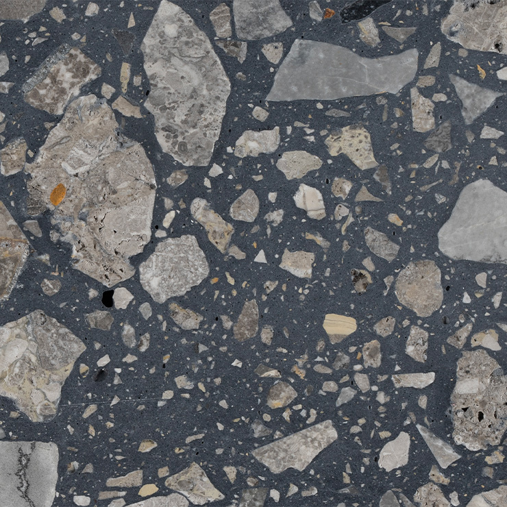 Ceppo Dark – Terrazzo-Platten werden aus sorgfältig ausgewählten Natursteinkörnungen hergestellt, die mit einem mineralischen Bindemittel vereint und zu massiven Platten verdichtet werden. Durch präzise Schleif- und Veredelungsprozesse entsteht ein langlebiger Werkstoff, der natürliche Optik mit außergewöhnlicher Robustheit kombiniert.