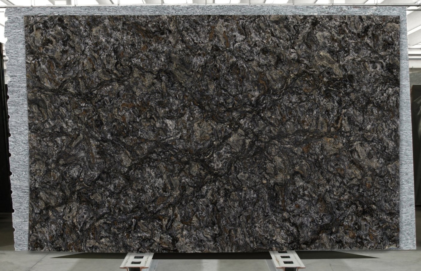 Asterix Granit – ein exklusiver Naturstein mit dunkler Grundstruktur und markanten, lebendigen Maserungen in hellen und kontrastreichen Nuancen.