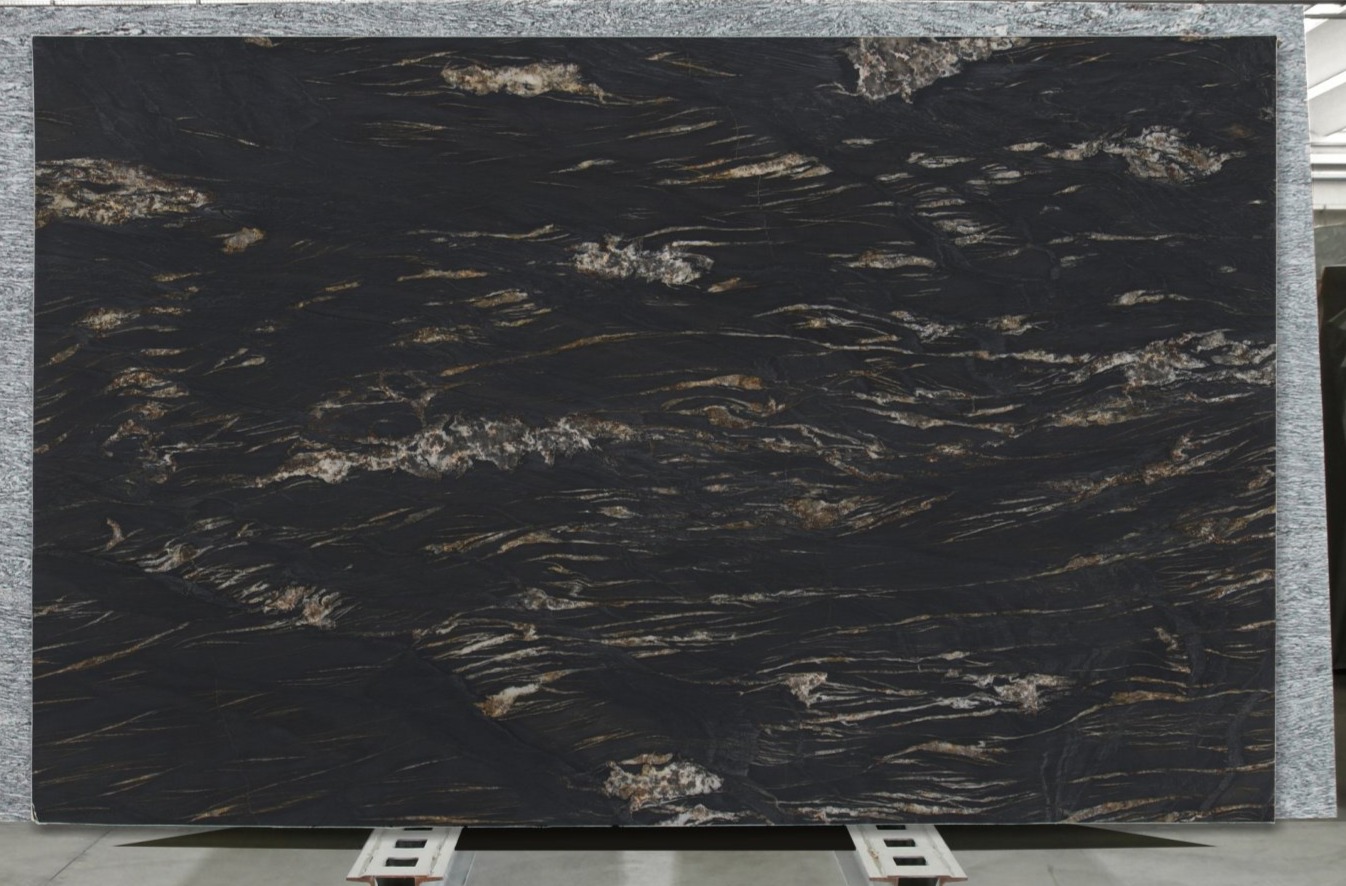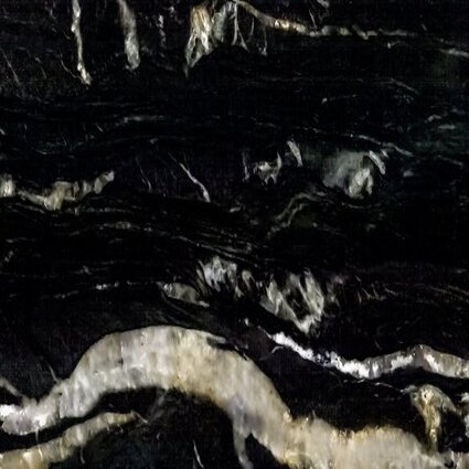 Belvedere Granit – ein exklusiver Naturstein mit tiefschwarzer Grundstruktur und markanten, fließenden Aderungen in Weiß- und Goldtönen.