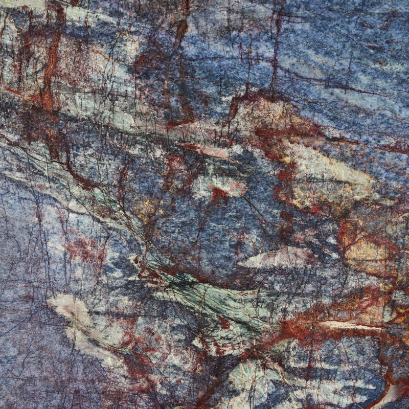 Blue Louise Quarzit – edler Naturstein mit lebendigen Blau-, Weiß-, Orange- und Brauntönen.