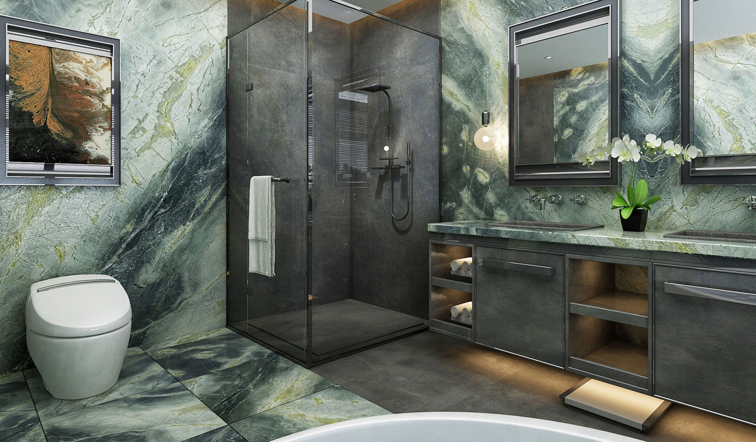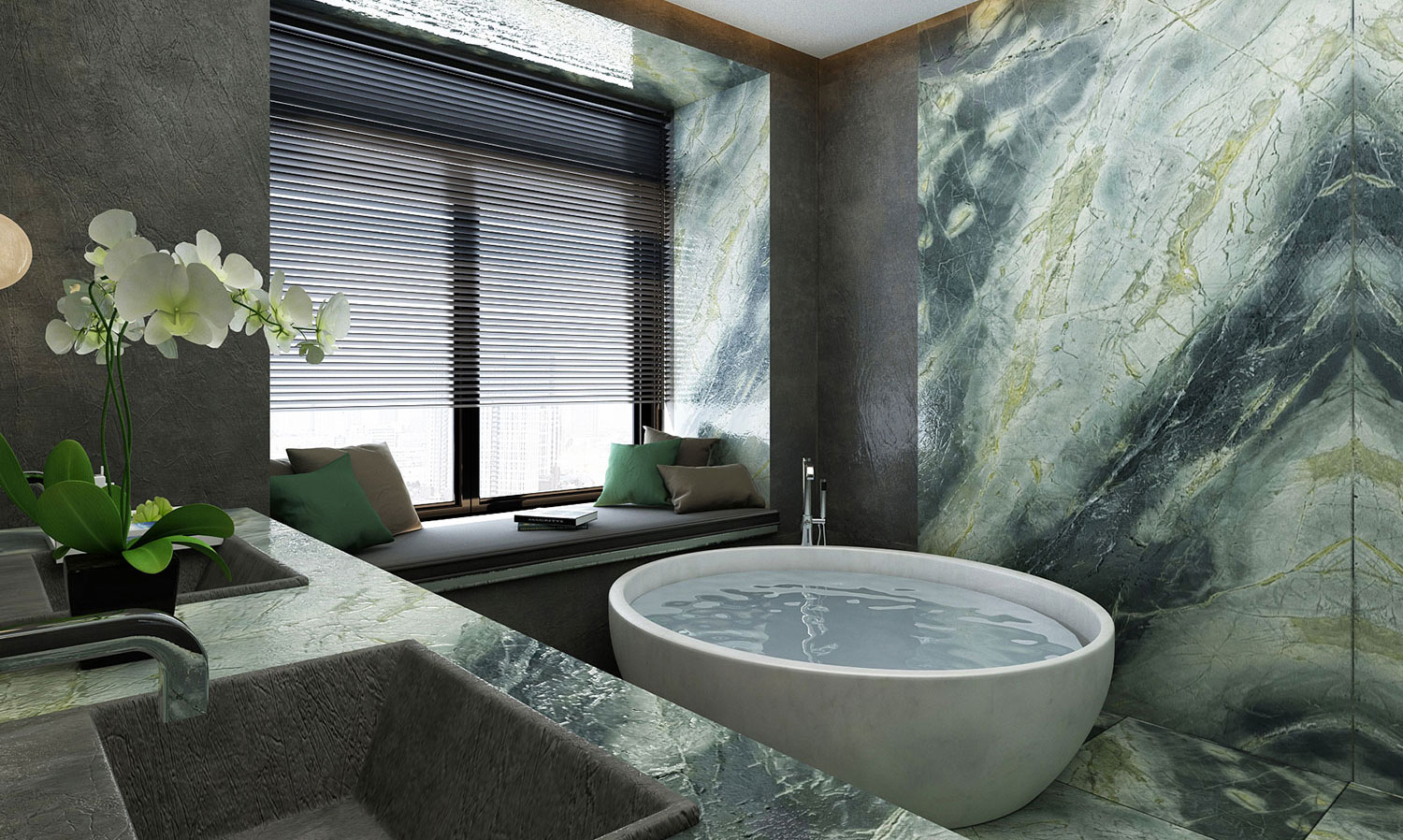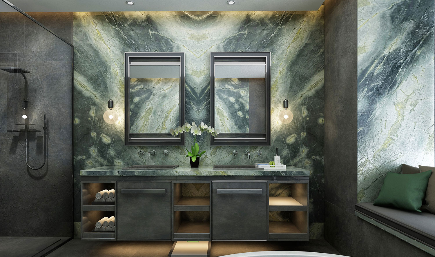 Botanic Green Quarzit – faszinierender grüner Naturstein mit goldenen und braunen Akzenten. Luxuriös, einzigartig und ideal für exklusive Innenarchitektur.