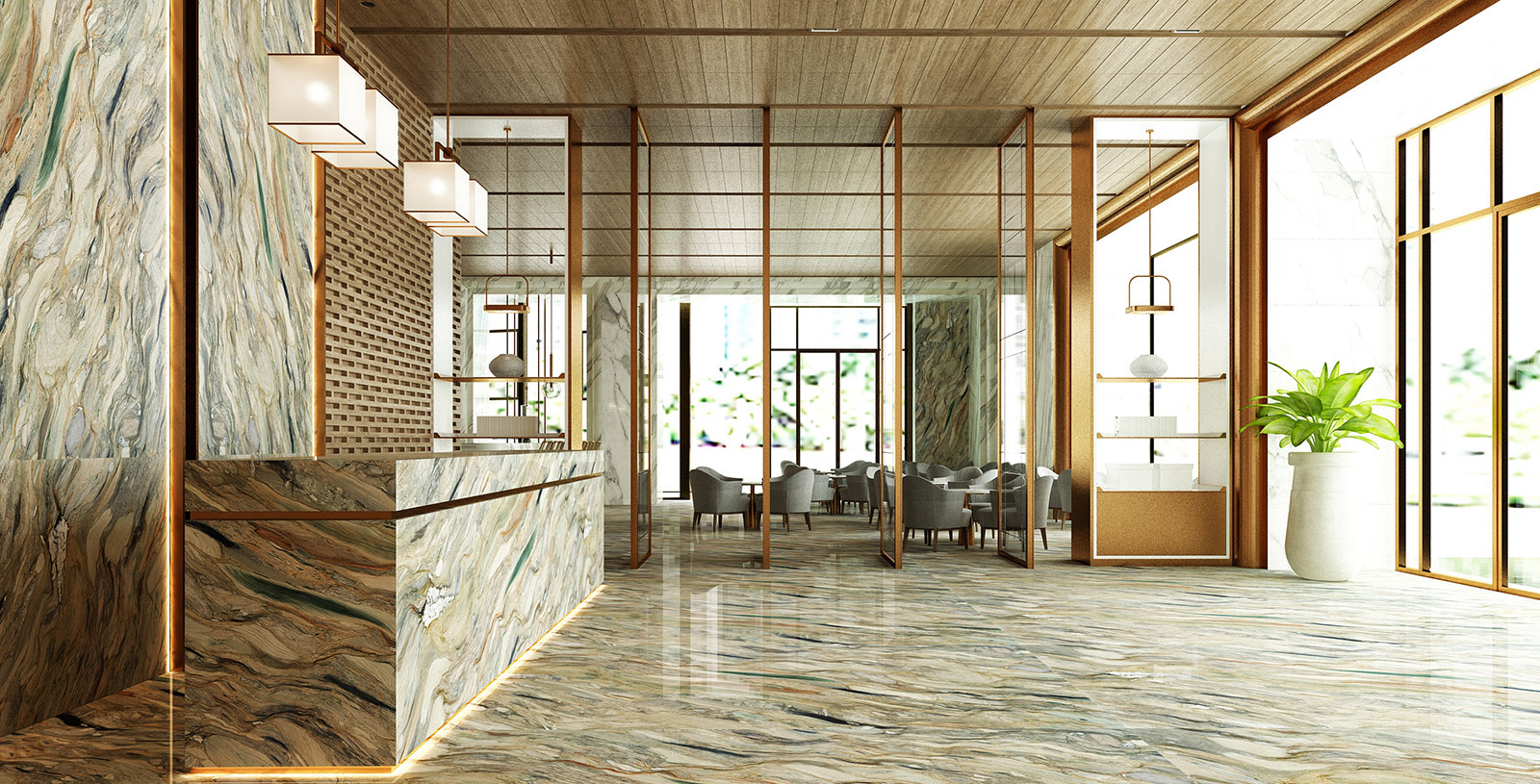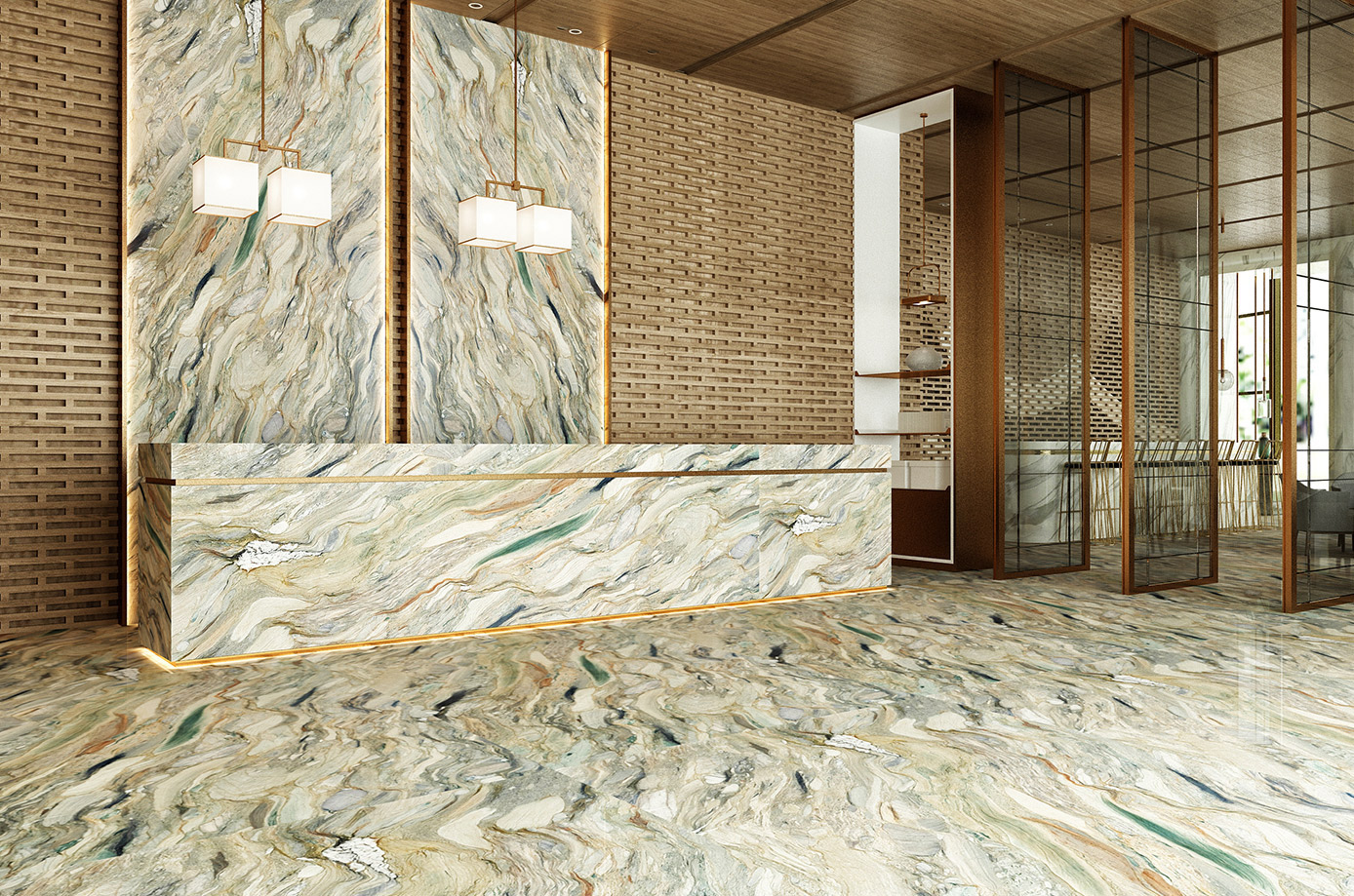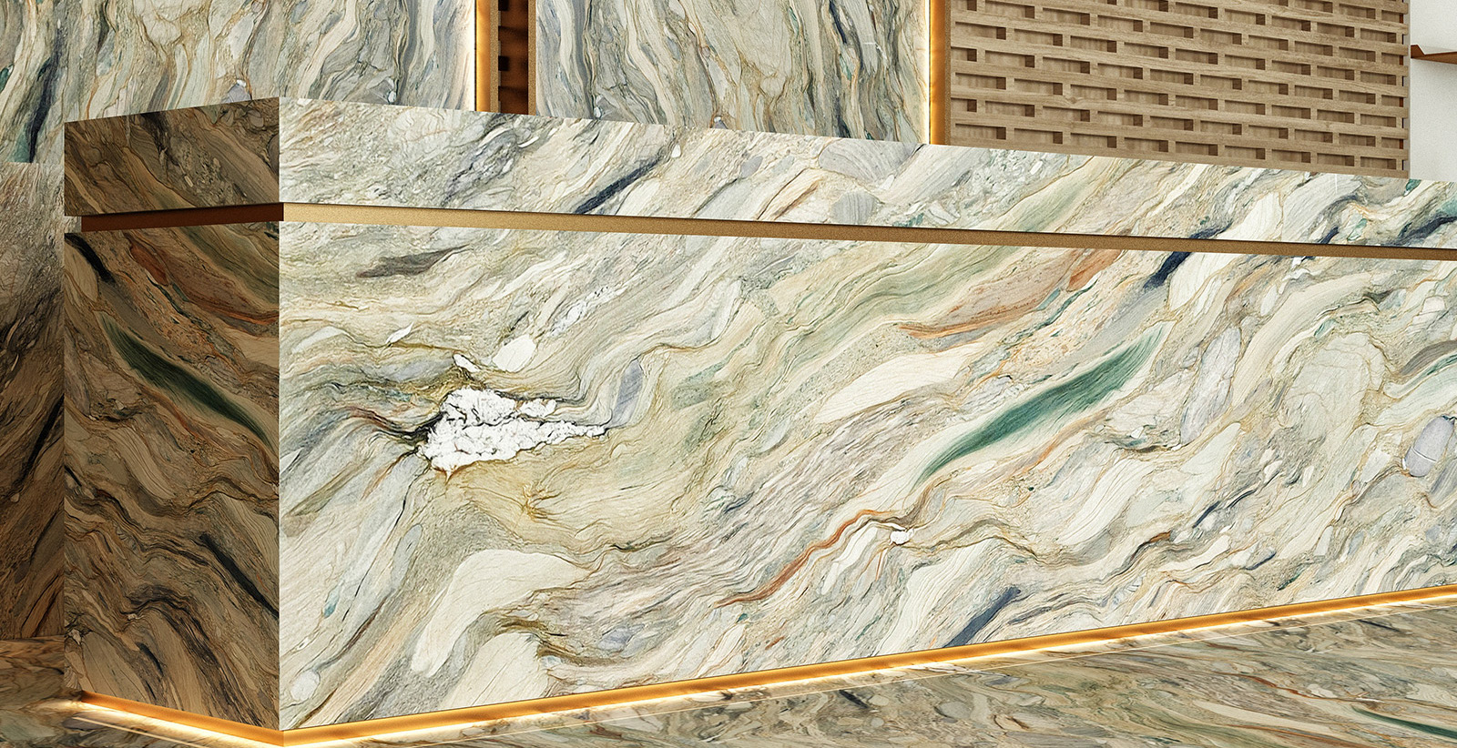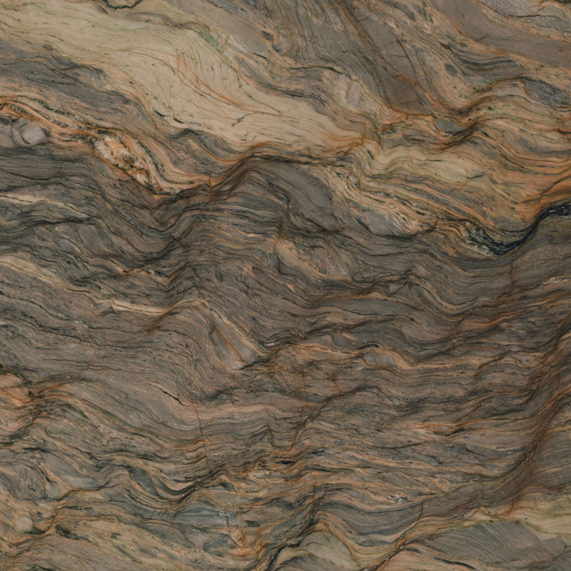 Fusion Quarzit – spektakulärer Naturstein in Blau-, Braun- und Goldtönen mit lebendiger Maserung. Luxuriös, edel und ideal für Designprojekte.