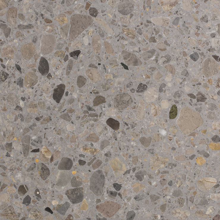 Grigio Rotondo – Terrazzo-Platten werden aus sorgfältig ausgewählten Natursteinkörnungen hergestellt, die mit einem mineralischen Bindemittel vereint und zu massiven Platten verdichtet werden. Durch präzise Schleif- und Veredelungsprozesse entsteht ein langlebiger Werkstoff, der natürliche Optik mit außergewöhnlicher Robustheit kombiniert.