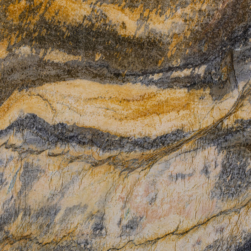 Jacaranda Quarzit – spektakulärer Naturstein in Braun-, Gold- und Grautönen mit lebendiger Maserung. Luxuriös, edel und ideal für Designprojekte.