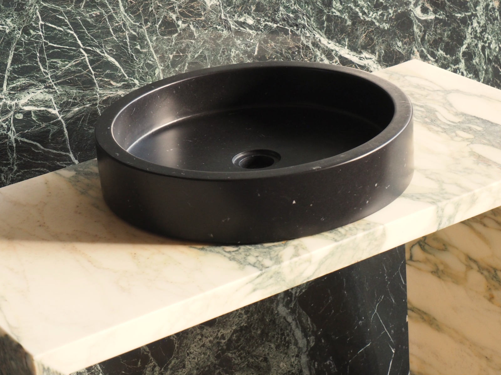 Mit seiner eleganten schwarzen Maserung und dem luxuriösen Natursteincharakter setzt das Waschbecken Lavandino Edge Nero einen exklusiven Akzent in jedem Badezimmer.