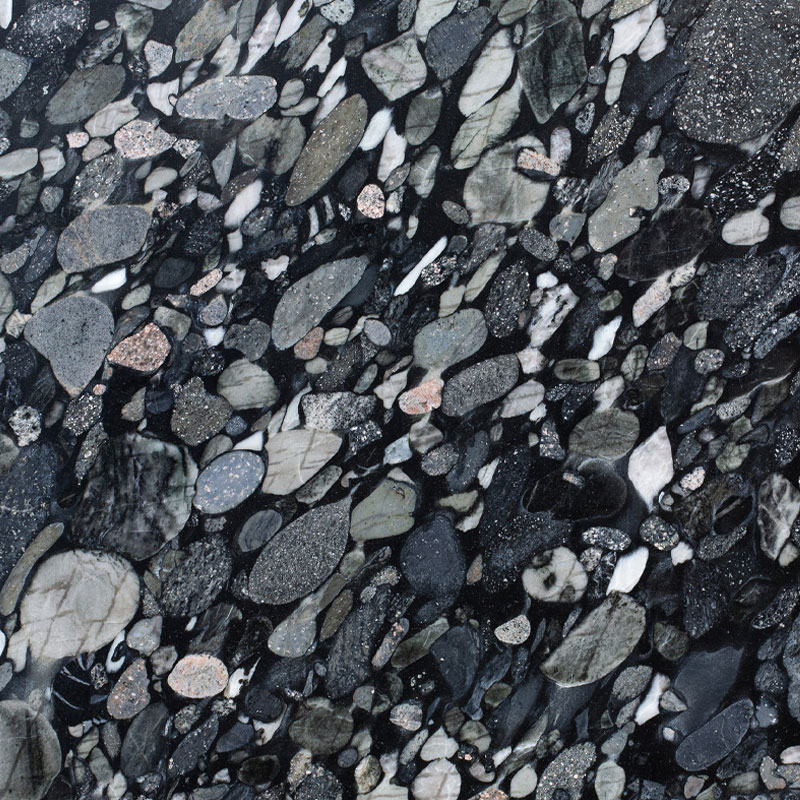 Marinace Black Granit – einzigartiger Naturstein mit polierter Kieselstein-Optik in Schwarz und Grau. Robust, edel und ideal für exklusive Innenräume.