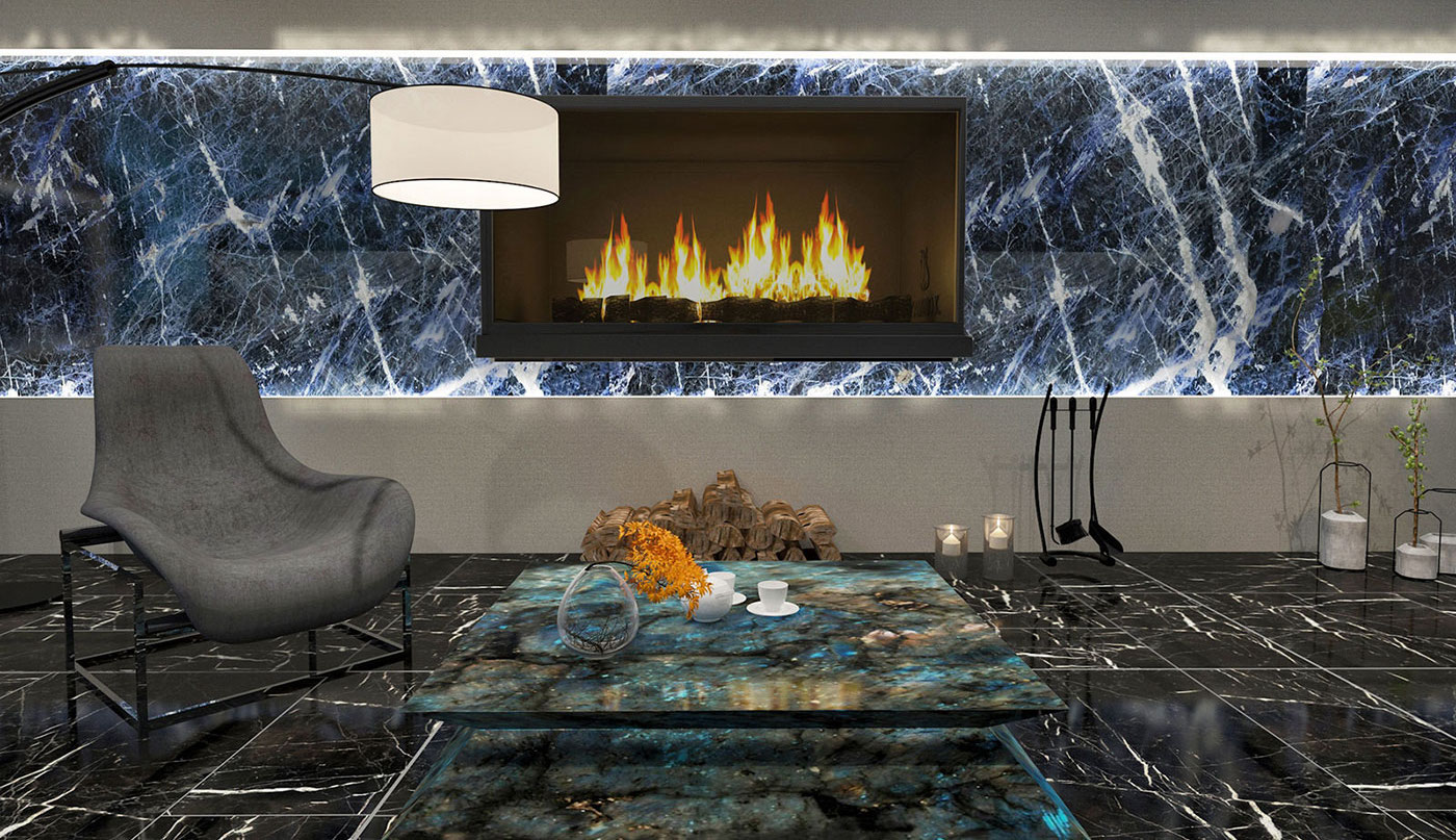 Sodalite Marmor – spektakulärer blauer Naturstein mit weißen und goldenen Adern. Exklusiv, luxuriös und ideal für außergewöhnliche Innenarchitektur.