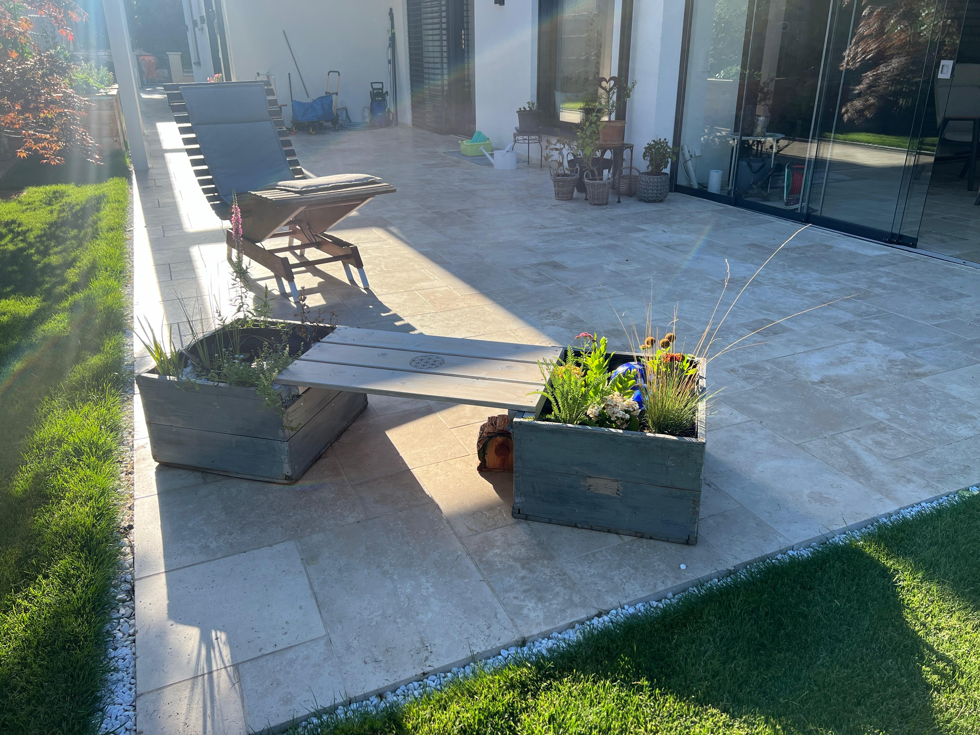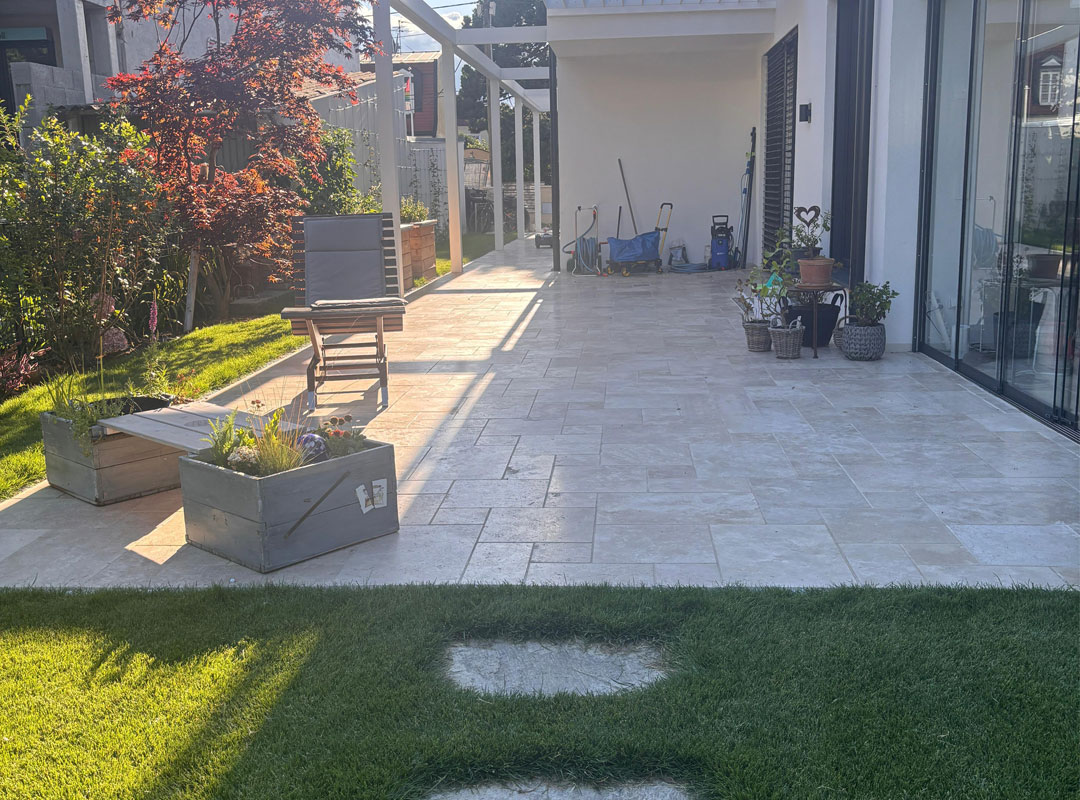 Die neue Terrasse schafft einen fließenden Übergang zwischen Innen- und Außenbereich. Großzügige Fensterfronten und der offene Gartenbereich werden durch den Travertin optisch verbunden. Der Naturstein harmoniert mit der modernen, klaren Architektur des Hauses und bietet gleichzeitig eine warme, einladende Atmosphäre für den Außenbereich.