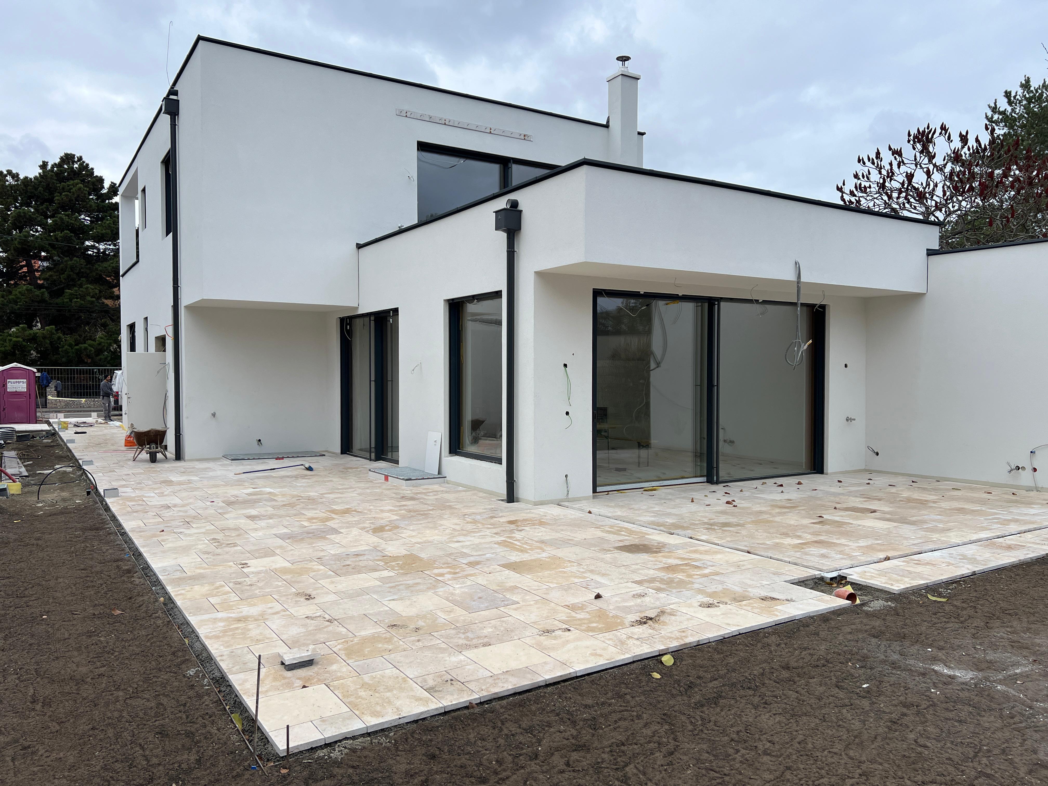 Für dieses Projekt in Wien haben wir eine großzügige Terrasse mit edlem Travertin gestaltet. Der Römischverband, ein zeitloses und elegantes Verlegemuster, verleiht der Fläche eine harmonische und lebendige Struktur. Die natürliche Farbvielfalt des Travertins sorgt für warme, mediterrane Akzente und fügt sich perfekt in die moderne Architektur des Hauses sowie in die grüne Gartenumgebung ein.