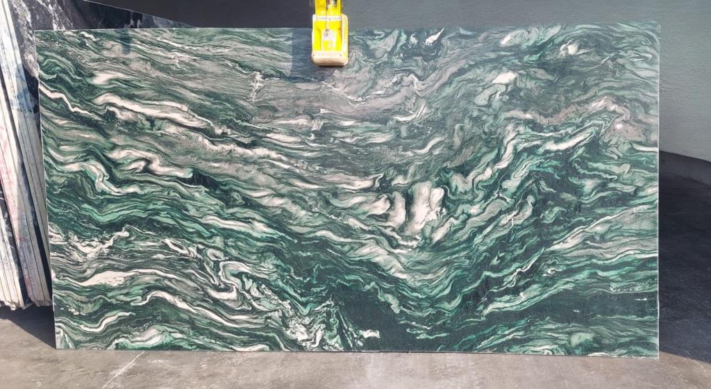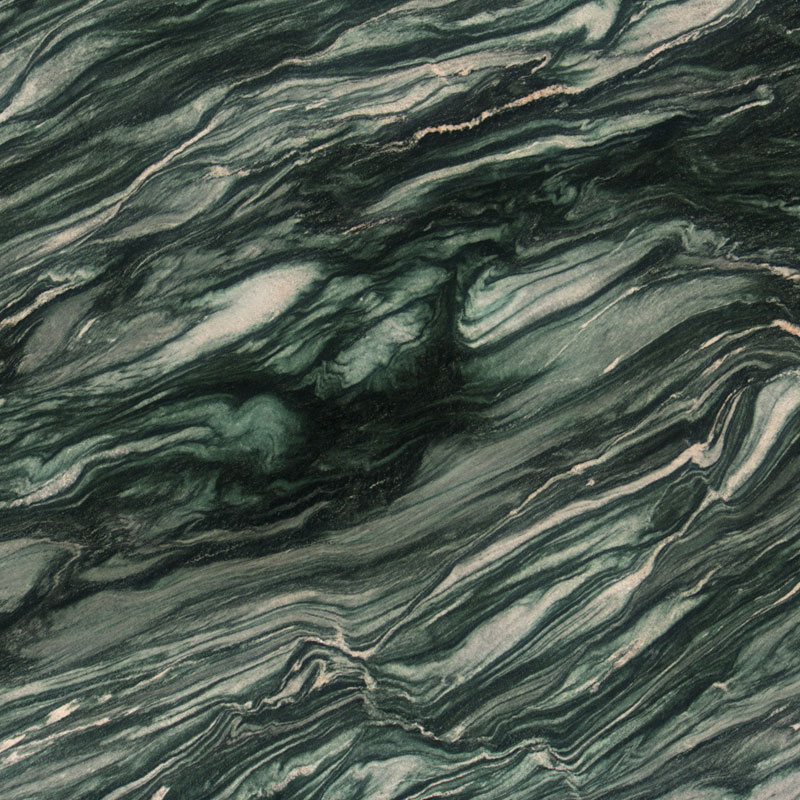 Verde Lapponia Granit – ein exklusiver Naturstein mit tiefgrüner Färbung und eleganten weißen sowie goldfarbenen Adern.