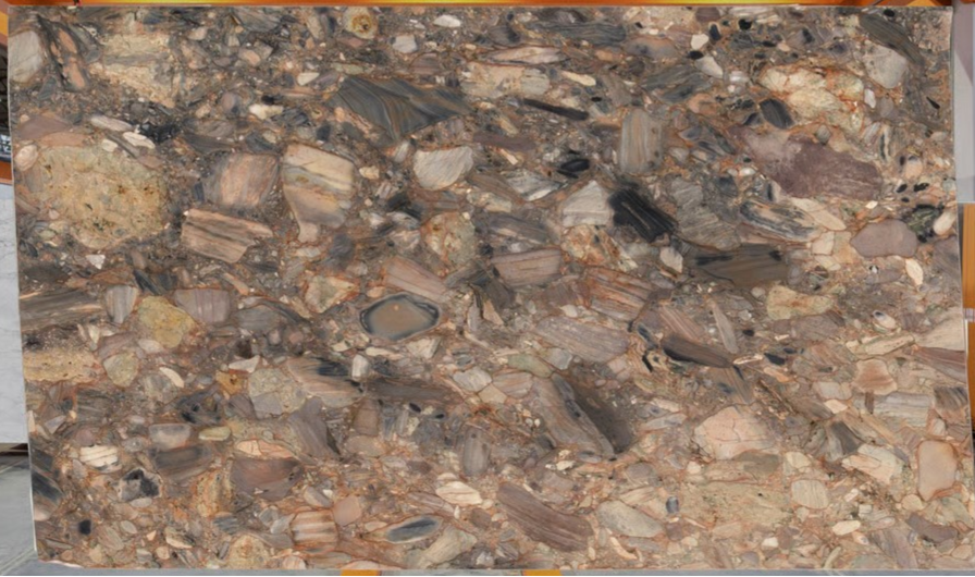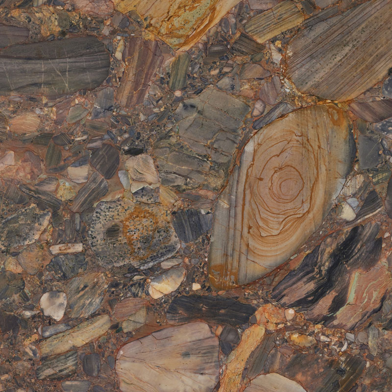 A premium quartzite featuring dynamic structures and a harmonious blend of green, beige, grey, and warm earth tones, enriched by striking natural veining. Each slab is a unique work of nature.